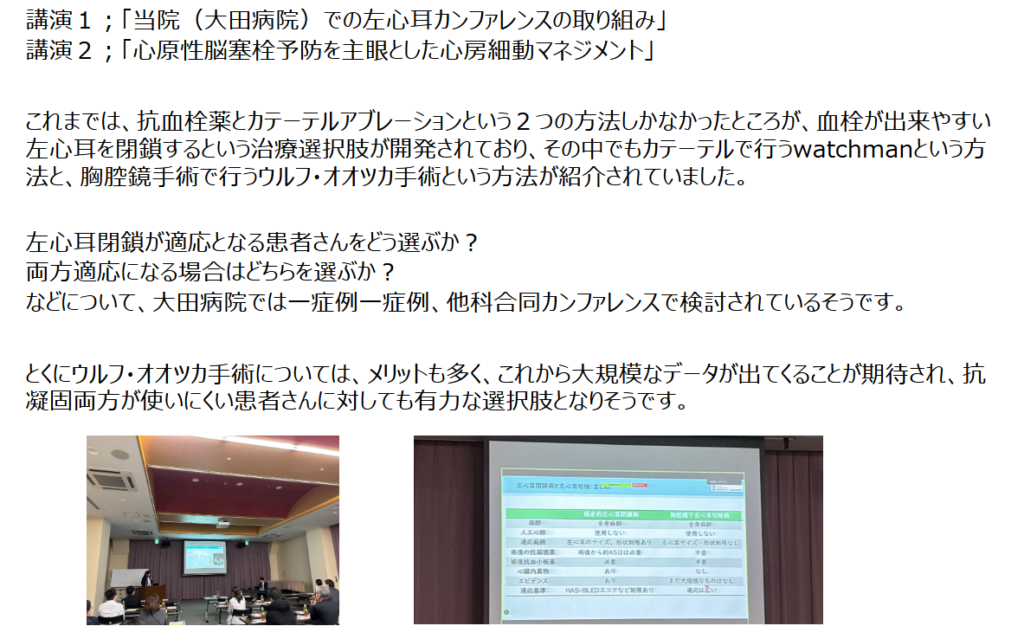 お知らせ 「急性期脳卒中診療の連携を考える会」 2026.01.23 大田病院で行われました「急性期脳卒中診療の連携を考える会」に参加いたしました。 第31回日本心臓リハビリテーション学会学術集会に参加いたしました。 前の記事 心臓リハビリをはじめました 次の記事